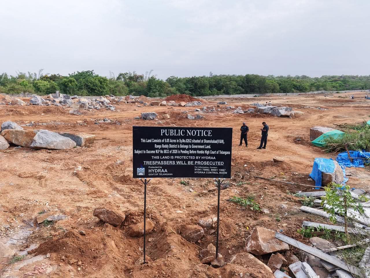 🔷రంగారెడ్డి జిల్లా శంషాబాద్ మండలం, గ్రామంలో 9.05 ఎకరాల ప్రభుత్వ భూమిని హైడ్రా బుధవారం కాపాడింది. దీని విలువ రూ. 90 కోట్లకు పైగా ఉంటుందని రెవెన్యూ అధికారులు చెబుతున్నారు. సర్వే నంబర్ 626/2లో మొత్తం 176.05 ఎకరాల ప్రభుత్వ భూమి రెవెన్యూ రికార్డుల ప్రకారం ఉంది. అటవీ అభివృద్ధి సంస్థకు 166 ఎకరాల భూమిని ప్రభుత్వం కేటాయించింది. ఇంకా అక్కడ 9.05 ఎకరాల ప్రభుత్వ భూమి మిగిలింది. ఖస్రా పహాణీ( గ్రామ పాత రికార్డుల) ప్రకారం మొత్తం 176.05 ప్రభుత్వ భూమిగా రికార్డుల్లో నమోదైంది. ఇందులోని 9.05 ఎకరాలను సీఎస్ 14 (నిజాంలకు చెందిన) భూములుగా పేర్కొంటూ కొంతమంది హక్కులు క్లైమ్ చేస్తున్నారు. ప్రభుత్వ భూమి అంటూ రెవెన్యూ అధికారులు చెబుతున్నారు. మొత్తానికి ఈ వివాదం హైకోర్టులో పెండింగ్ ఉంది. తుది తీర్పు వచ్చే వరకూ ఈ భూమి స్వరూపాన్ని మార్చరాదని, అక్కడ ఎలాంటి నిర్మాణాలు చేపట్టరాదని హైకోర్టు స్టే ఇచ్చింది. స్టేటస్ కో ఆర్డర్ను పట్టించుకోకుండా.. తజమ్ముల్ మొయినుద్దీన్ ఖాన్ అనే వ్యక్తి ఆ భూమిని చదును చేసి లే ఔట్గా మార్చినట్టు రంగరెడ్డి కలెక్టర్తో పాటు.. శంషాబాద్ మున్సిపల్ అధికారులకు ప్రజావాణిలో ఫిర్యాదులందాయి. క్షేత్ర స్థాయిలో పరిశీలించగా.. తజమ్ముల్ మొయినుద్దీన్ ఖాన్ 9.05 ఎకరాల భూమిని చదును చేసి.. ప్రీకాస్ట్ గోడల ద్వారా ఆక్రమించినట్లు రెవెన్యూ అధికారులు గుర్తించారు. భూ ఆక్రమణ చట్టం 1905 ప్రకారం ఆక్రమణలను తొలగించాలని మొయినుద్దీన్కు సూచించారు. ఇవేవీ పట్టించుకోకుండా.. అక్కడ కొన్ని ఇంటి స్థలాలు అమ్ముకున్నట్టు కూడా తెలుసుకున్నారు. రెవెన్యూ, మున్సిపల్ అధికారులు ఇదే విషయాన్ని హైడ్రాకు చెబుతూ.. ఆక్రమణలు తొలగించాలని లేఖ రాశారు. రెవెన్యూ, మున్సిపల్ అధికారుల ఫిర్యాదుతో బుధవారం హైడ్రా ఈ ఆపరేషన్ చేపట్టి.. 9.05 ఎకరాల ప్రభుత్వ భూమిలో ఆక్రమణలను తొలగించింది. చుట్టూ హైడ్రా ఫెన్సింగ్ వేసింది. ప్రభుత్వ భూమిగా పేర్కొంటూ హైడ్రా బోర్డులు ఏర్పాటు చేసింది. రెవెన్యూ అధికారులు, మున్సిపల్ అధికారుల సమక్షంలో ఈ కార్యక్రమాన్ని పూర్తి చేసింది